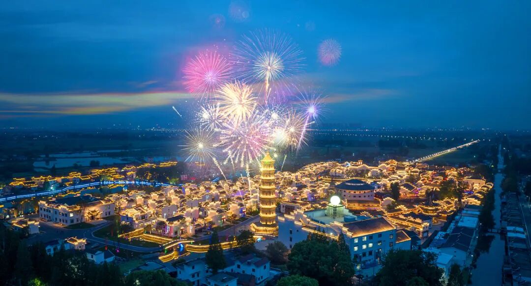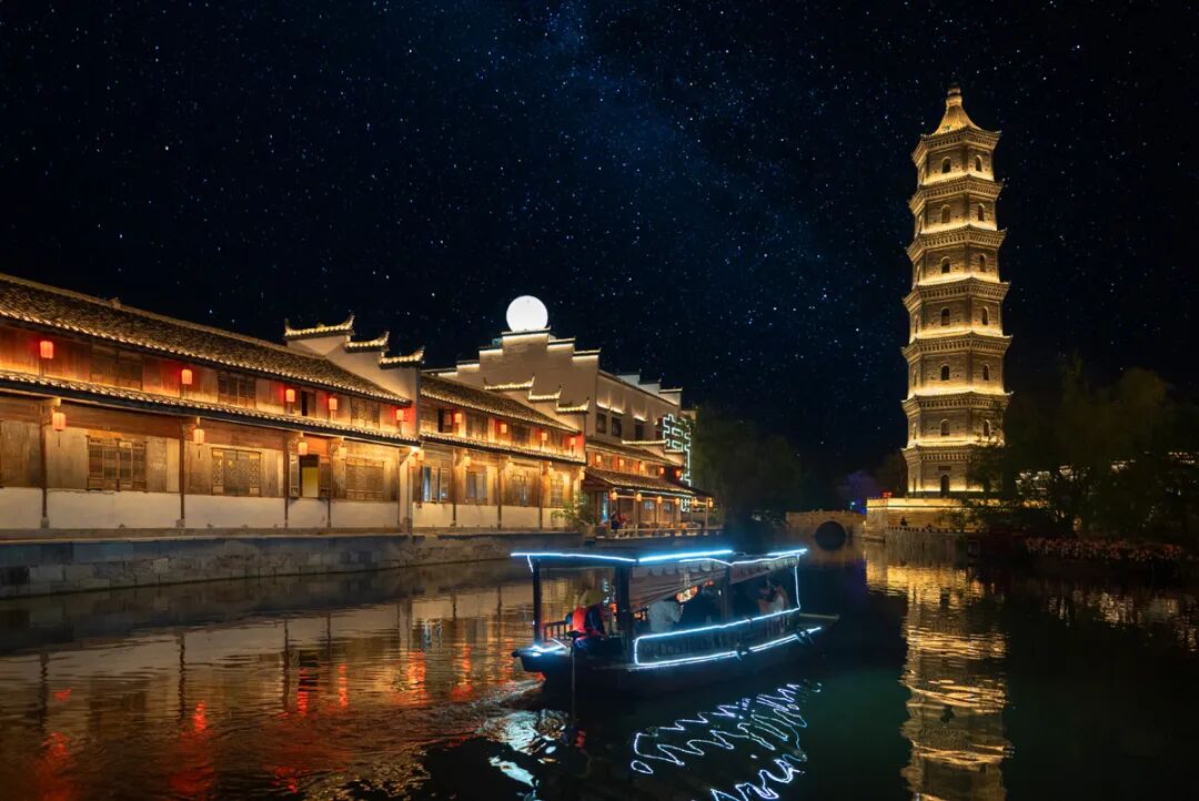 建于宋代的万丰塔。这座塔不仅建筑风格独特,而且塔内珍藏也十分丰富。夜晚华灯初上时,水镇内万盏灯火通明。站在美丽的犁桥之上,远处的万丰塔在彩灯的照射下流光溢彩,显眼非常。