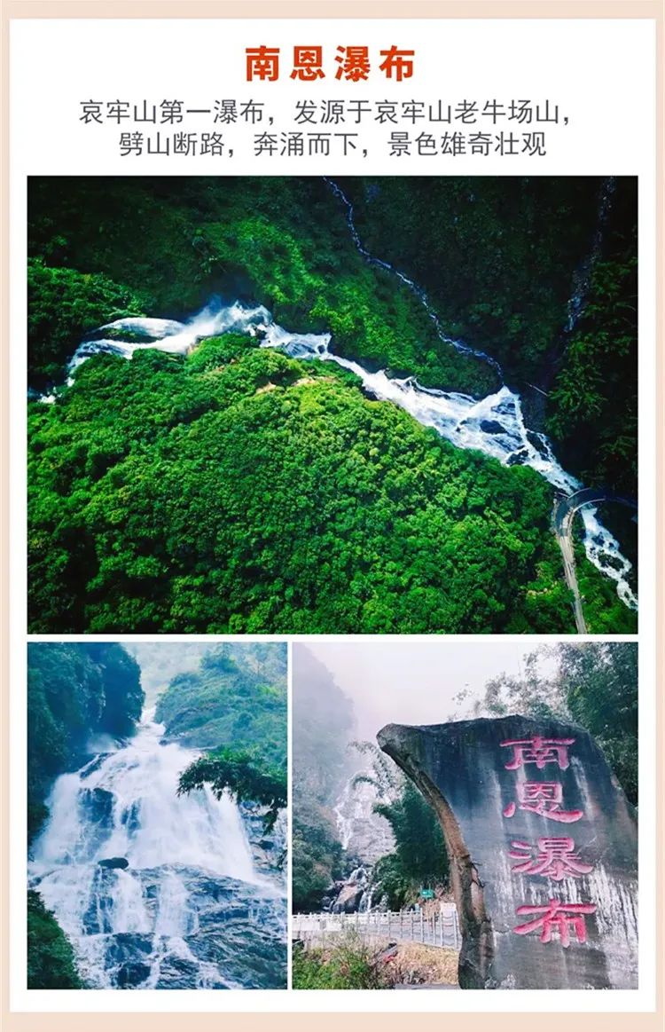 早餐后出发前往哀牢山,先到达源远流长的惊天飞瀑【南恩瀑布】。南恩瀑布是哀牢山第一瀑布,发源于哀牢山老牛场山,劈山断路,奔涌而下,景色雄奇壮观;接着游览小桥流水,曲径通幽、又因其自然的景色酷似九寨沟,被游客称为“哀牢山上的九寨沟”的【石门峡】。