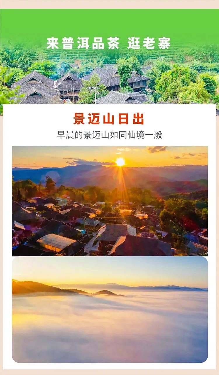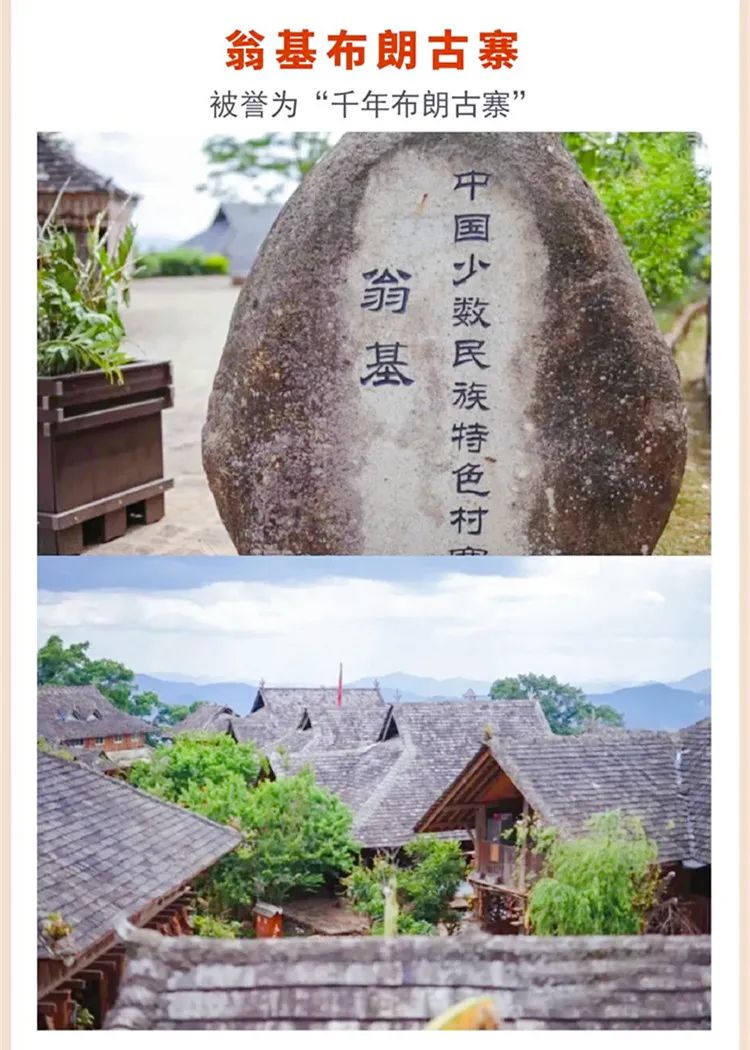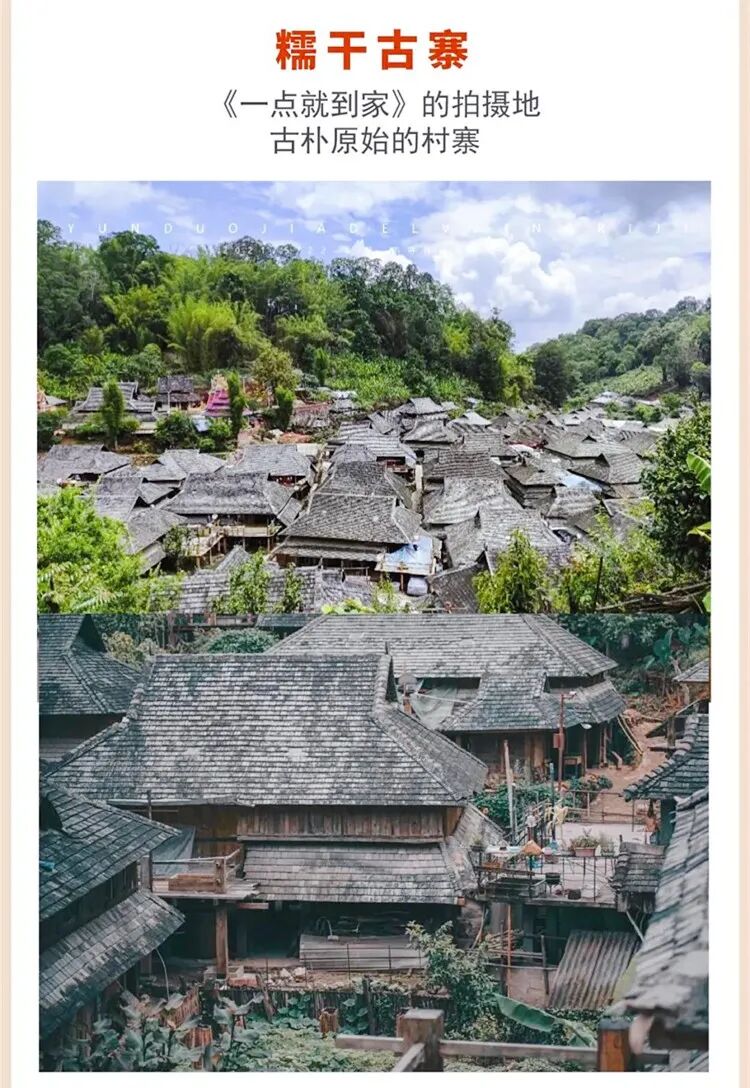 【神秘原始】:沿途森林覆盖率极高,古村落古茶树众多,非常适合修身养性。特别探访电影《一点就到家》的拍摄地糯干古寨、布朗翁基古寨、和综艺《向往的生活》拍摄地曼远村。在傣族水寨糯干古寨,看炊烟袅袅,听鸡鸣狗吠,感受世外桃源的静谧;在布朗族古寨翁基古寨,随处都是干栏式的民居,四处茶水飘香,日出、日落、云海,每一处景致,都能满足你对美的想象。
