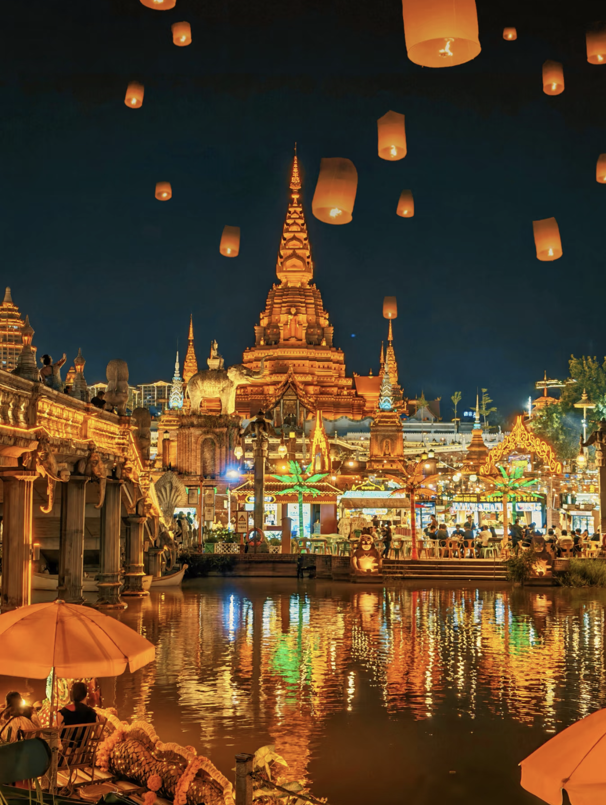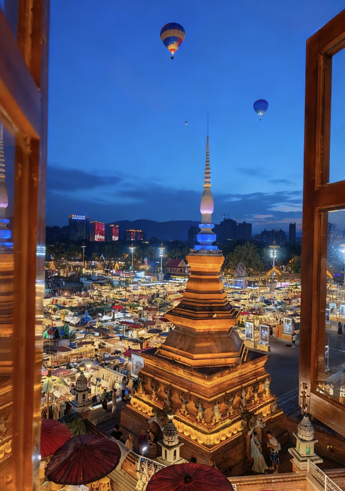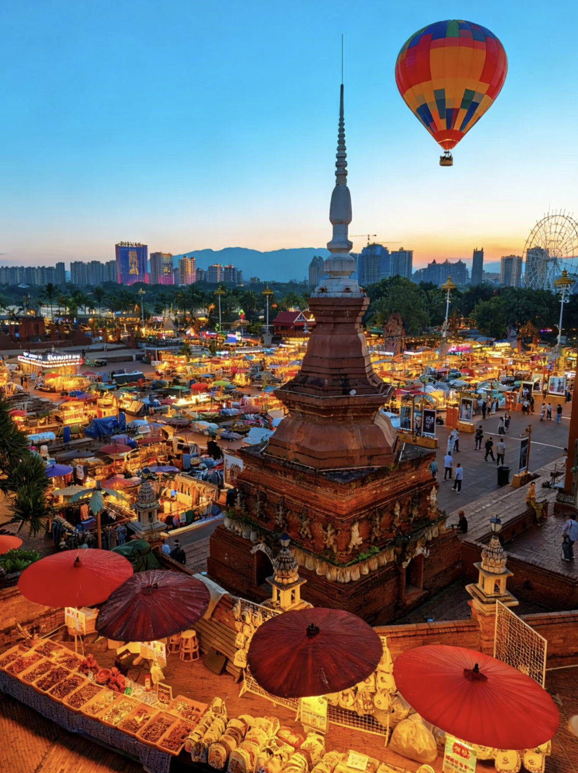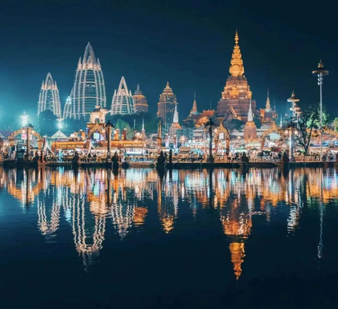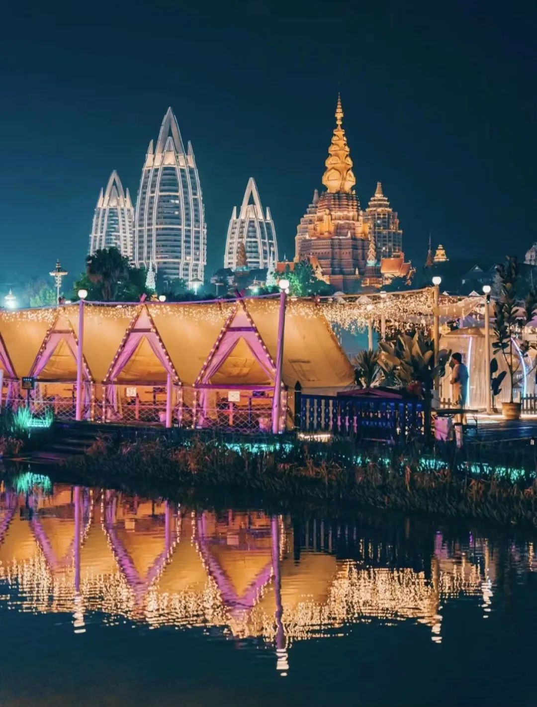 景洪西双告庄景—告庄西双景,九塔十二寨,它从历史和传说中走来,是智者再创造的经典。它为历史上的不夜城平添了新时代的气息,为有着异国情调的边陲之城丰富了多姿多彩的民族文化。