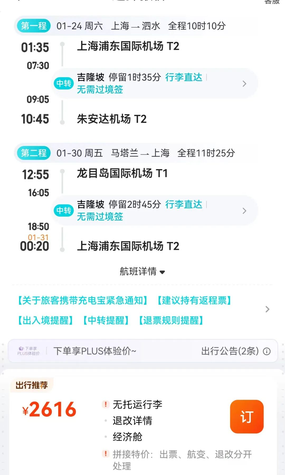 ✈航班参考(2选1)(有时差实际航程60分钟)