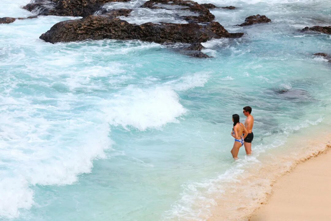 天神浴池是天然形成的火山岩无边泳池。因为海浪的日积月累,将此地方侵蚀成一个独特的岩内浴池景观,浴池外是广阔的蓝色大海。天神浴池外面是波涛汹涌的大海,如果海浪比较大的时候,在浴池内拍照就会有危险。
