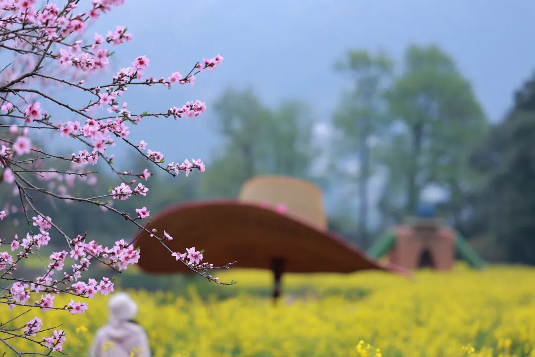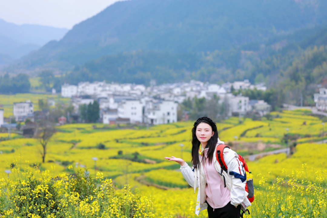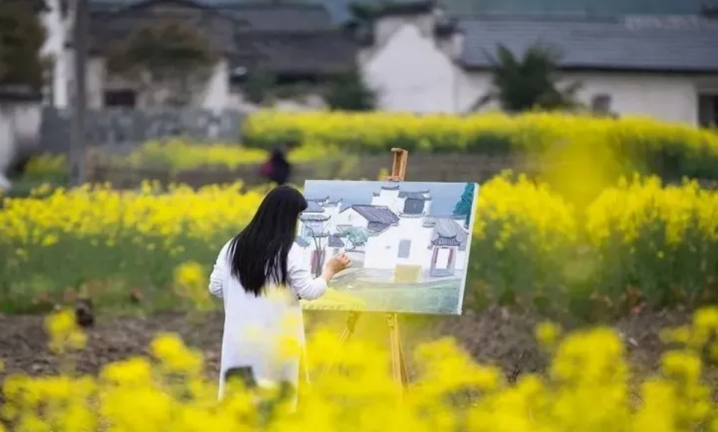 黄灿灿的油菜花与远山、近水、粉墙、黛瓦相映成趣