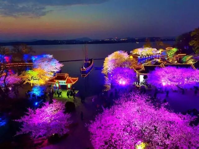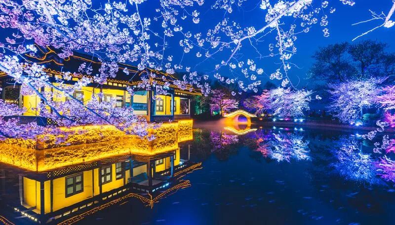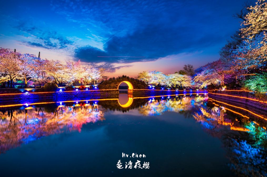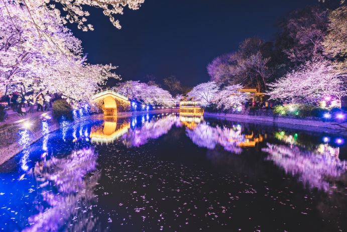 18:00 开始夜间的赏花,感受如梦似幻的夜樱视觉盛宴,还有梦话的烟花秀。太湖鼋头渚的樱花,白天是姿态万千,如云似霞;入夜,暮色四合、浮华散尽,抬头望去,深邃的夜空如一幕巨大的蓝丝绒,五颜六色的灯光将古老的长春桥畔的樱花衬托的绚丽多姿,玉树琼花,韵味十足。让人流连忘返、诗情画意美得HOLD不住。
