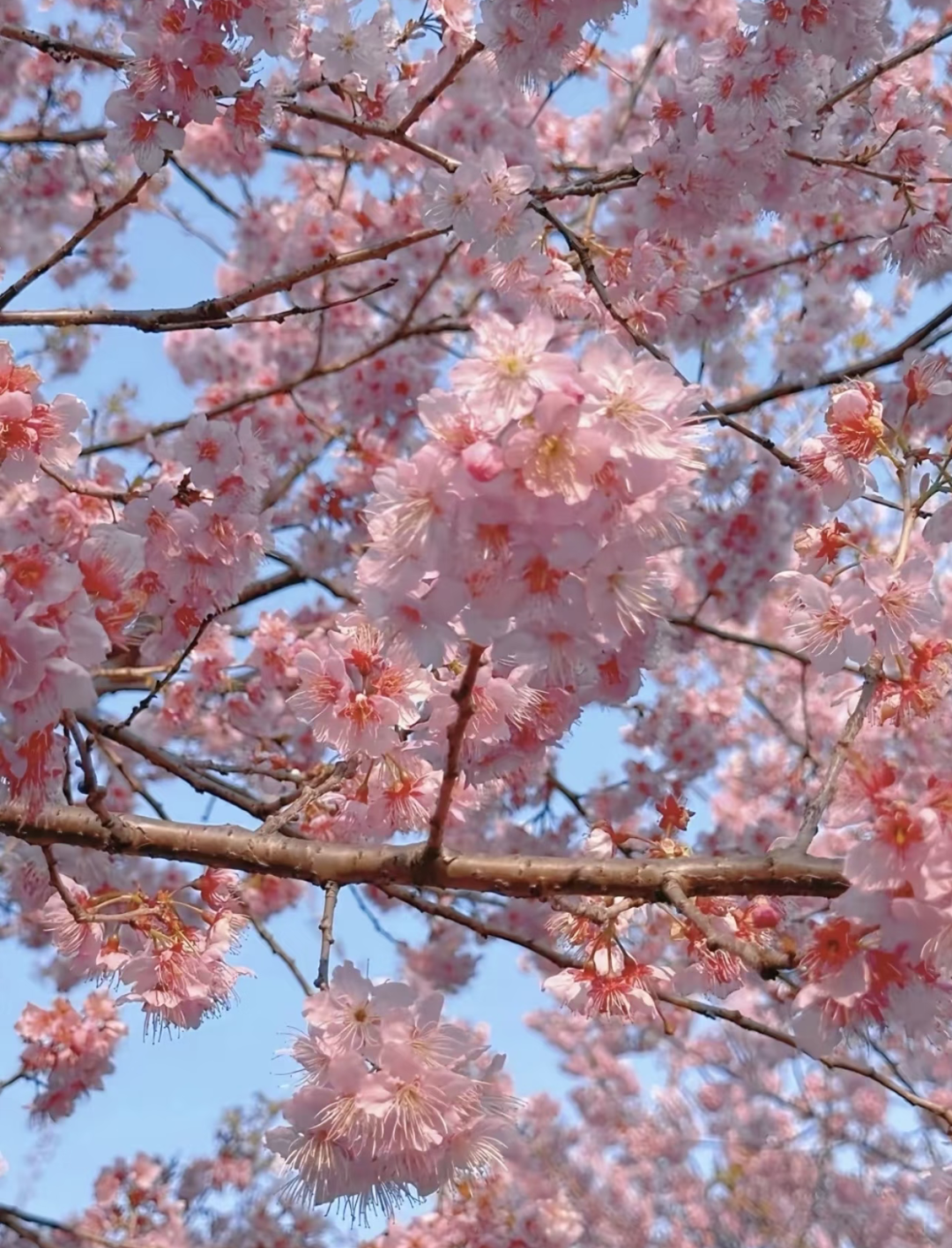 不似寻常梅花的粉嫩娇柔,这里的美人梅红得热烈、开得张扬,漫山灼灼,肆意怒放。