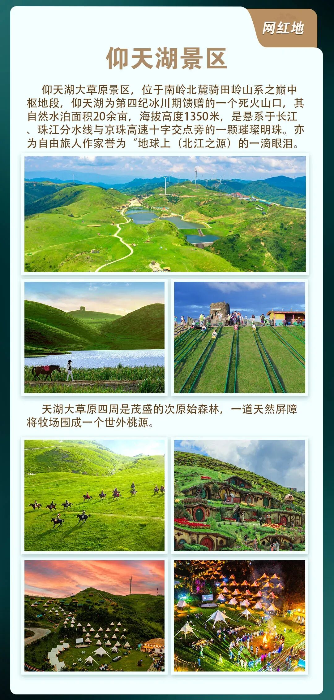 早餐后集合坐车前往仰天湖高山草原(车程约1.5小时),到达景区仰天湖高山草原门口,一直被网友们称为“南方的呼伦贝尔大草原”四周草苔遍野,苇荡丛生,高耸入云的“大风车”沿着山脊蜿蜒数百公里,犹如一条巨龙腾空远去,蔚为壮观。可以在草原上体验一下跑马的快感、策马狂奔,想起来就令人向往。不想骑马的可以在一望无际的草原上漫步。景区还养殖有梅花鹿、羊驼、黑天鹅等珍稀小动物……仰天湖卧佛金仙寨游玩结束