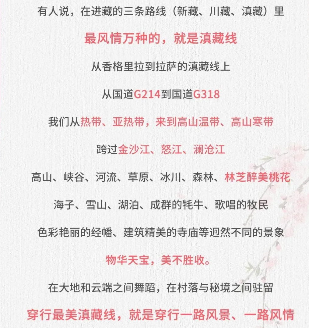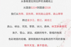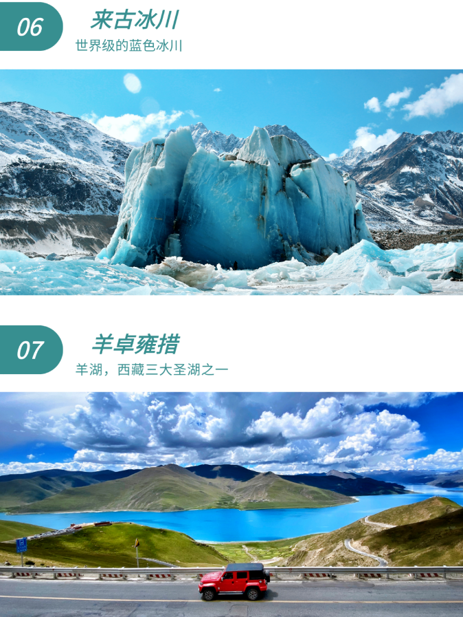 精选经典景点,删掉鸡肋景点。高原湖泊、草地、雪山,藏民风俗体验。一条路线,精神和感官双重刺激。