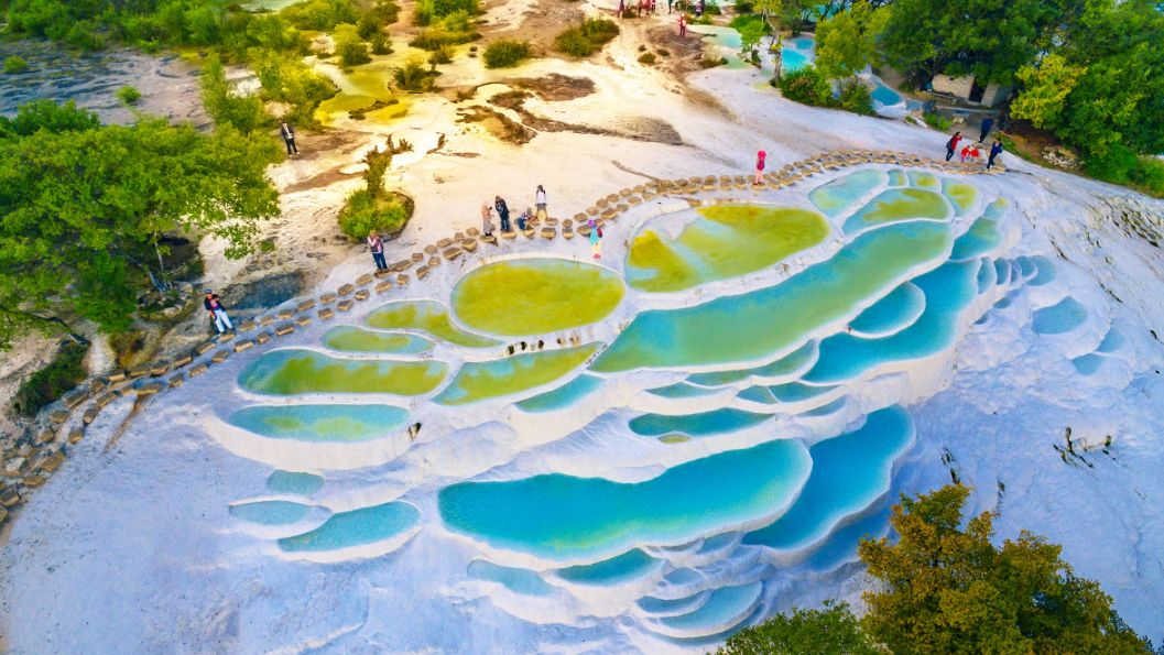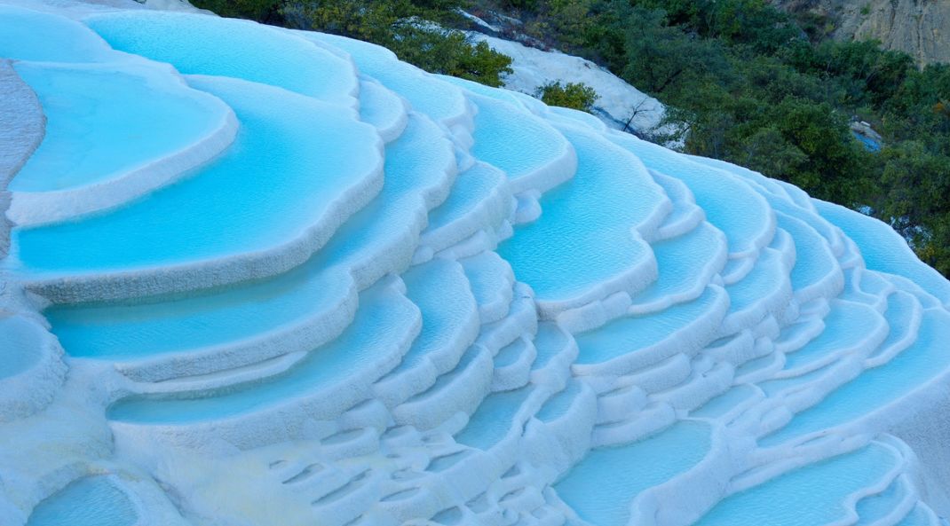 白水台:位于哈巴山山麓,其造型酷似一层层梯田,不仅是纳西族东巴教的发祥地,也是一块纯天然的美景地。从远处看,一块块台幔,好似一片片被冻结的白色瀑布,在阳光下熠熠生辉。从近处看,每一块钙化池中,还缓缓流动着一汪汪碧水,水质纯净,清澈的可以倒映出蓝天白云的影子。阳光会把池水折射出不同的色彩,加上蓝天白云的倒影,整个白水台好似仙境一般,让人流连忘返。