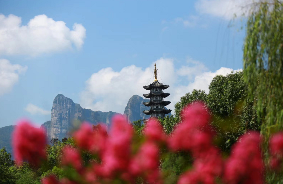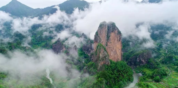 随后前往【石桅岩】,石桅岩擎天拔地,有“浙南天柱”之誉,堪称华夏之冠。为一块高306米的浅红色巨石,岩顶如并蒂莲蕾,比肩而耸,形似船桅,故名石桅岩。石桅岩三面环溪,与石桅隔溪相对诸峰,簇拥环立,然高不及半,皆不敢与之“试比高”,“于远处遥望,无不尽其仰慕惶恐之忱”,更显出了石桅岩高耸入云的气势。