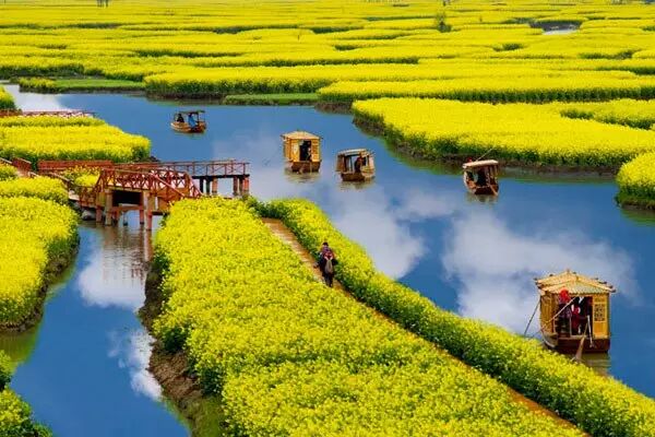 至今为止,兴化是唯一一个把油菜花和水景结合的如此完美的景点,没有之一。在这里,乘木船的优雅不输贡多拉,花垛田的情调不输威尼斯水系。